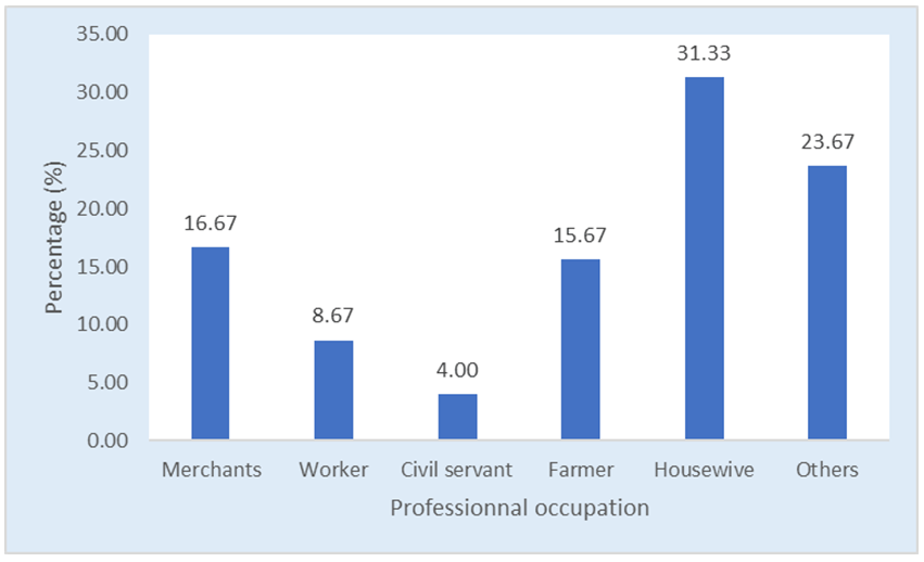 In all, 300 householders, 57% women and 43% men, had participated in the study. Householders were on average 45-year-old with a standard deviation of 15 years. Thus, it was noted that 58.30% of surveyed households had more than six members, more than half of householders (53%) did not attend school; moreover, a third of householders (31.3%) are housewives and the two dominant professions, apart from the latter, are merchants (16.7%) and farmers (15.7%). Only 4% of householders are civil servants with a minor proportion of working class (0.7%) (Table 10).