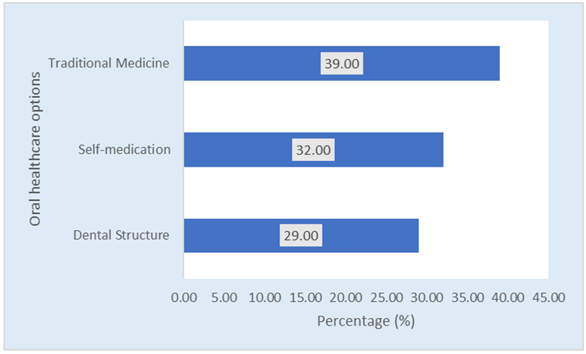 Intuitively, the first step in the analysis of oral healthcare access is to look at the proportion of householders using the different oral healthcare options. In this perspective, results of the analysis showed that traditional medicine is the most used option with 39.00% of householders pointing it out as their first option in case of dental pain. It is followed by self-medication which is used by 32.00% of householders. Dental structures are less popular with only 29.00% of householders having access to them (Figure 2). | ||||||