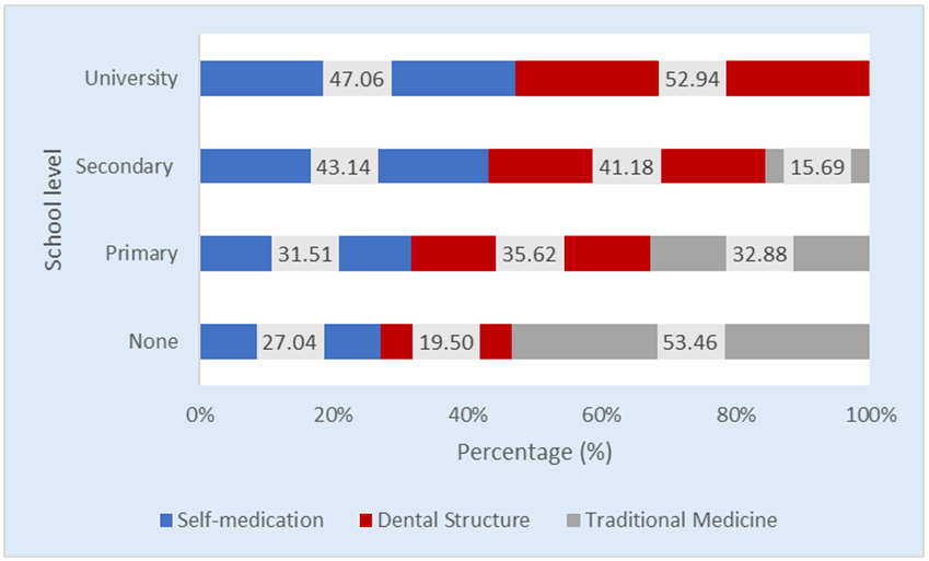 One aspect of the access to oral healthcare is the school level of householders as it captures how informed the later are about each oral healthcare option. The results of this study show that householders with high school level have most likely more access to dental structure. In fact, more than one householder out of two (52.94%) in the university subgroup have access to dental structures and nobody in this subgroup use traditional medicine when a household member has toothache. In contrary, householders who have never enrolled in school have different behavior. In this subgroup, 53.46% of householders use traditional medicine (Figure 3). Moreover, it was noticed that the higher the householder school level is, the more the household has access to dental structures or self-medication. The chi-square statistic test reveals a significant relationship between access to oral healthcare and householders’ school level (Table 2). | ||||||