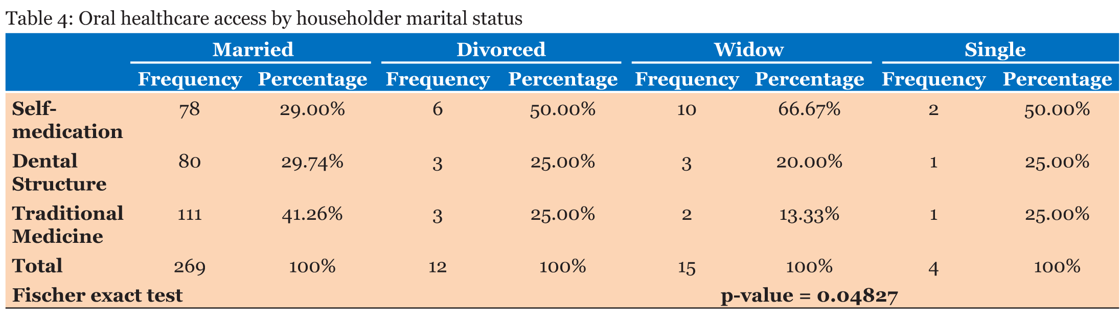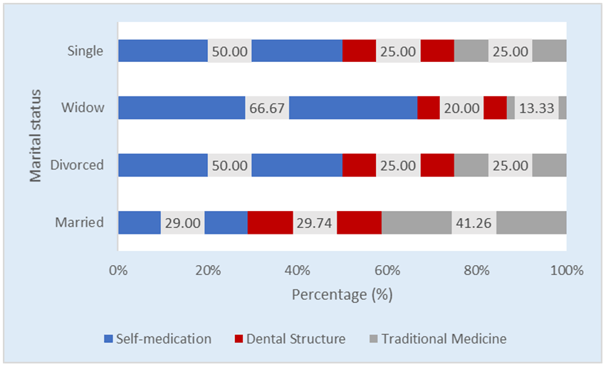 Percentage of households having access to oral healthcare varies slightly according to householders’ marital status (Figure 5). Thus, it was noticed that married householders have both more access to dental structures (29.74%) and the highest percentage of traditional medicine users (41.26%). In contrary, widow householders most likely practice self-medication and have the lowest percentage of traditional medicine users. In fact, 66.67% of them practice self-medication while only 13.33% use traditional medicine. In addition, single and divorced householders seem to have the same behavior towards oral healthcare option. In these two subgroups, a half of householders (50%) practices self-medication while one householder out of four (25%) have access to dental structures. The fisher exact statistic confirms the linkage between oral healthcare access and the householder marital status at 95% significance level (Figure 5), (Table 4). | ||||||