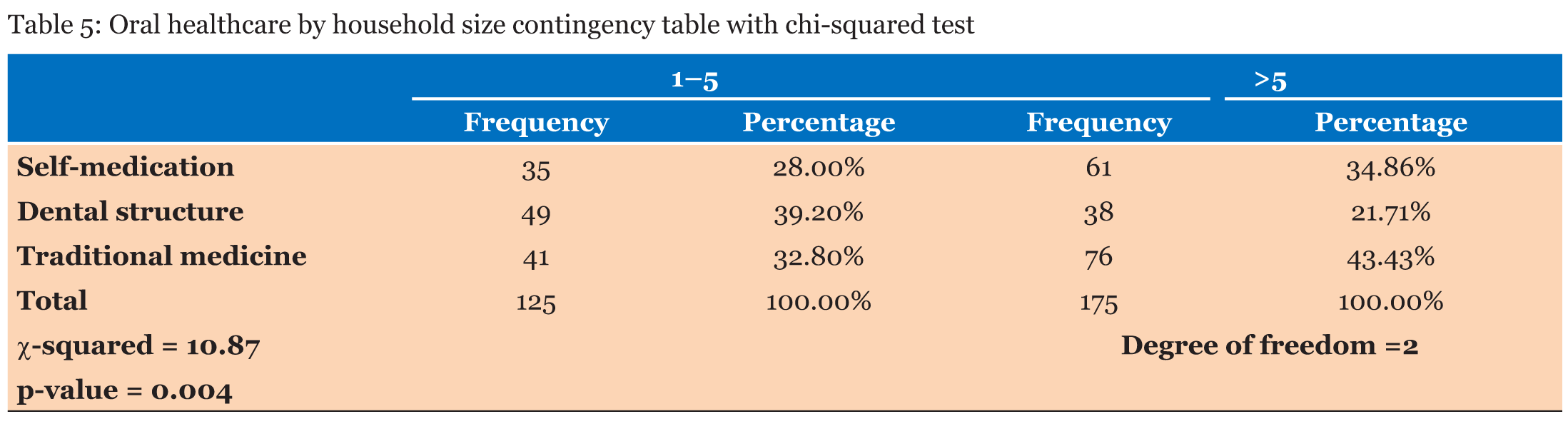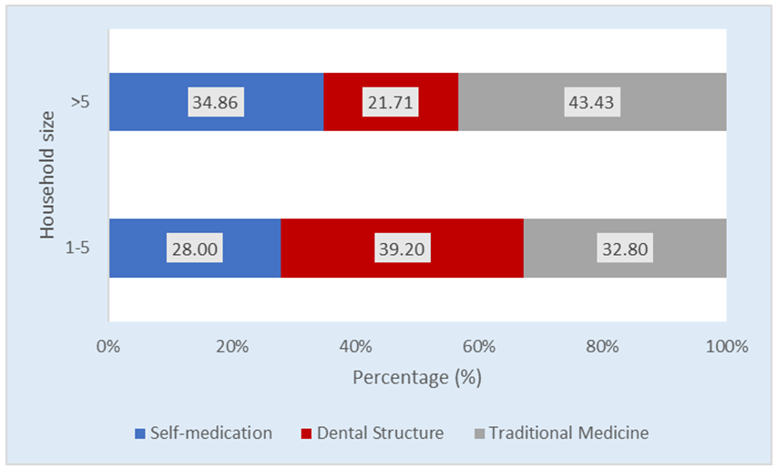 Households having access to oral healthcare vary also accordingly to their size. Households that have less than five members have more access to dental structures in comparison to the ones that count more than five members. The percentage of households having access to oral healthcare is 39.20% in the group of households with less than five members, while this percentage is 21.71% in the second group leading to a gap of 18.49%. In addition, households with more than five members are more likely traditional medicine users or practice self-medication. In fact, more than four out of ten (43.43%) householders in that group say that family members use traditional medicine when they have toothache and 34.86% of them practice self-medication. In the contrary, in the group of households with less than five members, only 28% practice self-medication. The chi-squared statistic test reveals a link between oral healthcare access and households’ size at 99% significance level (Figure 6), (Table 5). | ||||||