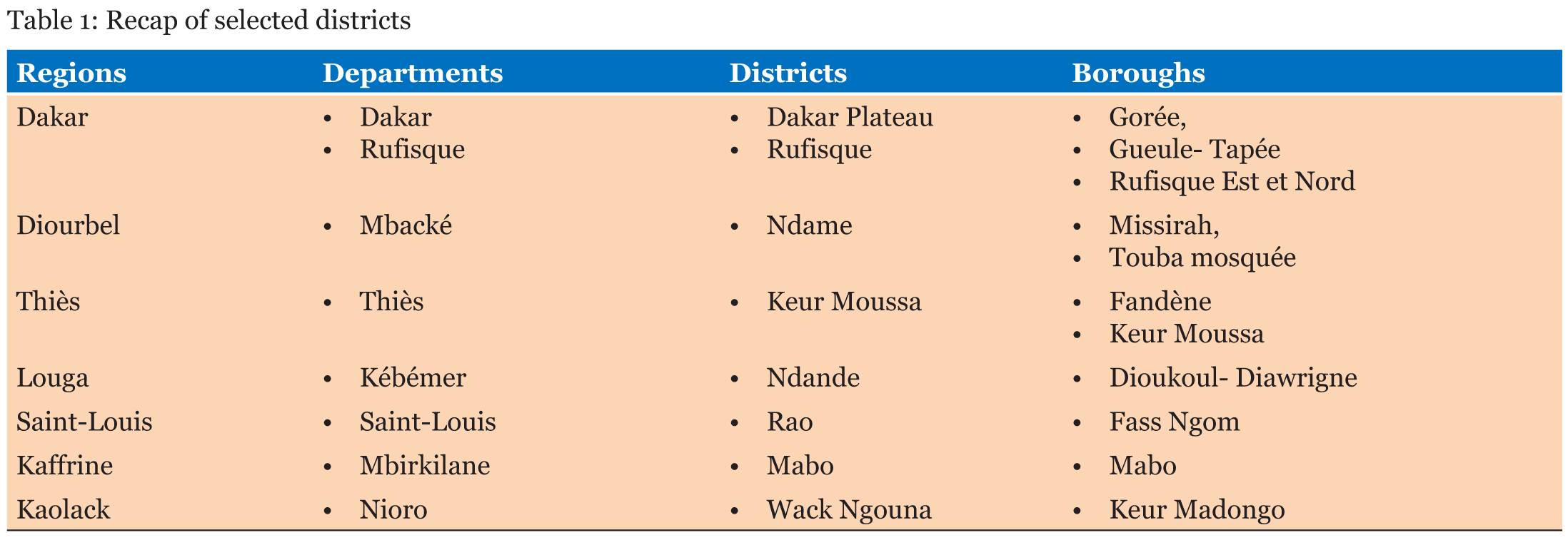 The adopted sampling procedure is that of the WHO, described in its basic methods. Indeed, WHO’s recommendations suggest the choice of twelve sites nationwide; four from the capital, four from two major regions and four from rural areas [4]. In other words, it consisted of surveying 100 households in the capital (Dakar), 100 in two economically important regions (Thiès and Diourbel) with respectively 50 households each, and 100 households in four other randomly selected regions. The study focused on health insurance. Therefore, the choice of the four sites was based on the Decentralization and Extension of Coverage of Health Insurance’s project (DECHI) [5]. Thus, the regions of Saint-Louis, Louga, Kaolack and Kaffrine were selected. One department per region (except for Dakar where 2 departments were selected) with districts and boroughs, were randomly selected (Table 1). In each borough, from house to house, the person in charge of the family’s medical care is interviewed. In the absence of the householder, the spouse is interviewed. In the case of districts with several neighborhoods (Gueule Tapée - Fass - Colobane), one neighborhood is randomly selected. | ||||||