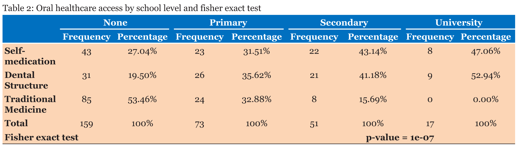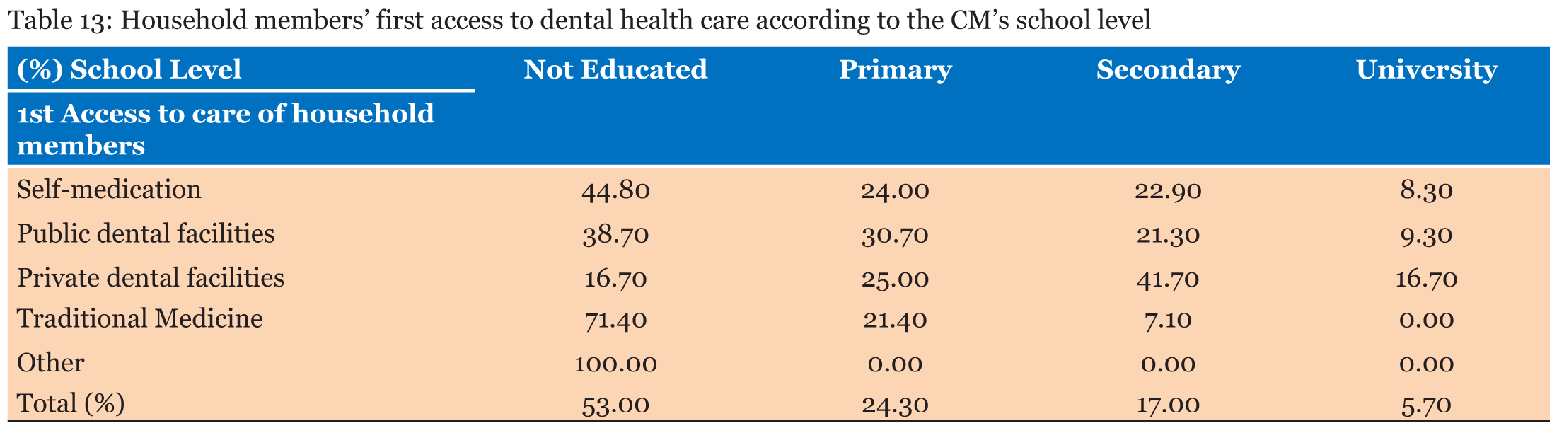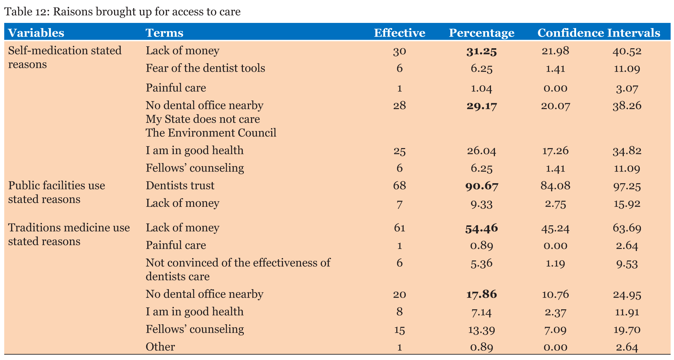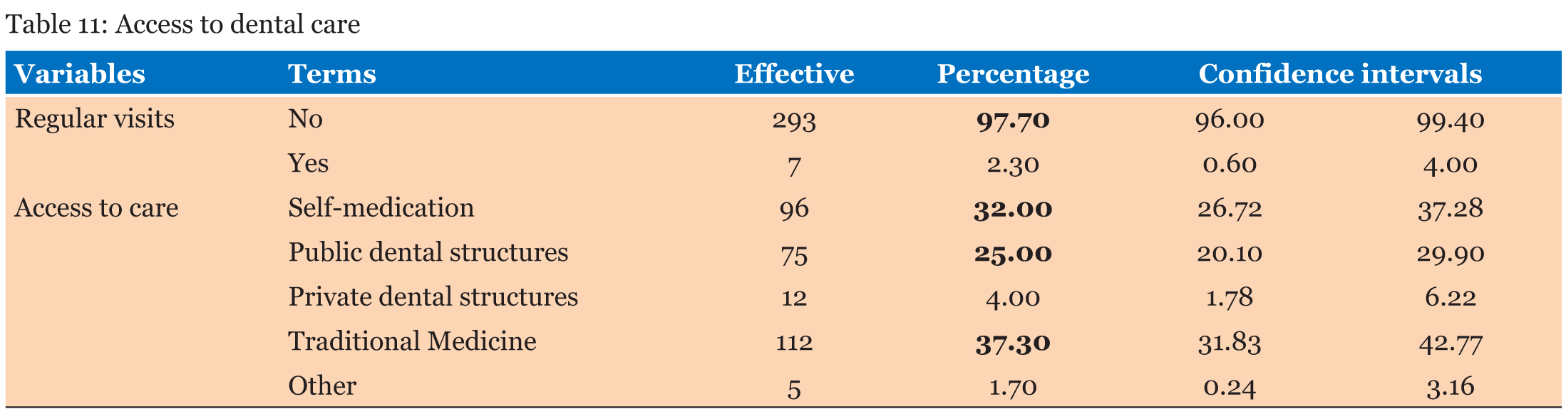 Regarding regular annual visits, 97.7% of householders recognize that members of their household do not go to the dentist. The study reveals that 37% of households use traditional medicine and 32% self-medicate themselves when in dental pain. Only 29% of households receive dental care in the event of dental pain (Table 11). Regarding the choice of cure, 60.5% of those who self-medicate themselves justify their choice either for financial difficulties (31.3%) or for the remoteness of dental structures (29.2%). For traditional medicine users, 72.4% are motivated by fellows’ counseling and pain caused by the care received, and only 5.4% of them are doubtful of the effectiveness of care provided by dentists. Moreover, all those who attend private dental structures, as well as the 90.7% of those who go to public facilities, do so out of trust to medical doctors (Table 12). The cross-checking of level of education and type of care’s variables shows that 44.8% of householders who self-medicate themselves have never attended school, while 61.3% of public health facilities users have. Similarly, 71.4% of householders who use traditional medicine have never attended school, while 83.3% of private dental facilities goers have (Table 13). | ||||||