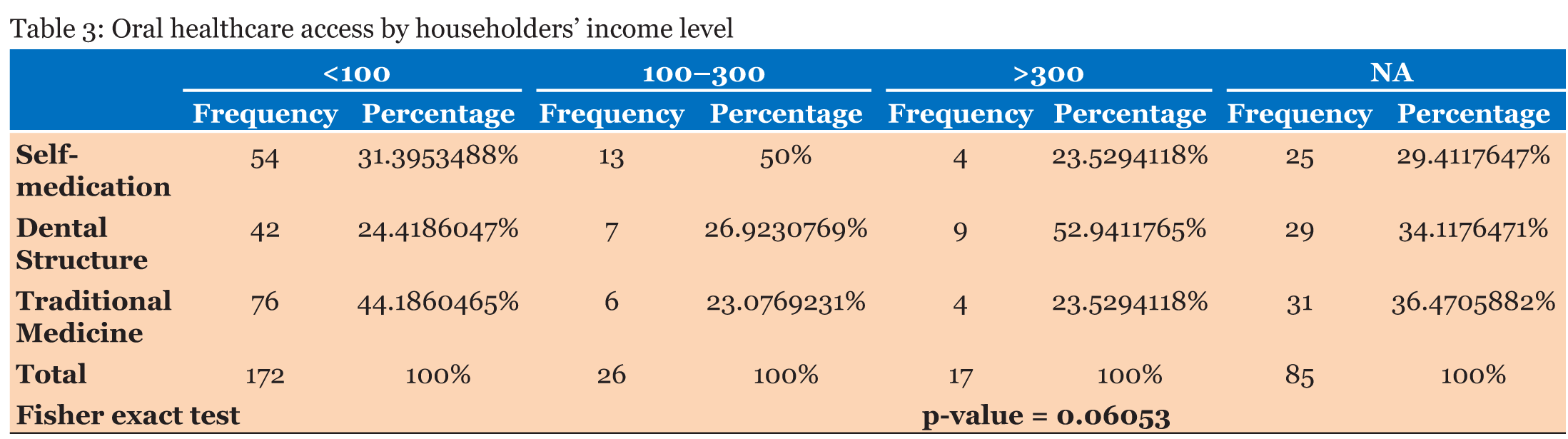 Householders that have greater monthly income (>300,000 FCFA, more than three hundred thousand) have more access to dental structures. In fact, 52.94% of them have access to dental structures while 23.3% practice self-medication. When it comes to householders with intermediate income level, it was noticed that a half of householders (50.00%) practice self-medication while more than one householder out of four (26.92%) have access to dental structures. As for the income level, the results show that the higher the monthly income of householder is the more the household has access to oral healthcare. In order to confirm the statistical relationship between access to oral healthcare and income level, the fisher exact statistic test has been computed instead of chi-square test because of low frequency in contingency cells. Thus, the results confirm the link at 90% significance level (Figure 4) , (Table 3). | ||||||