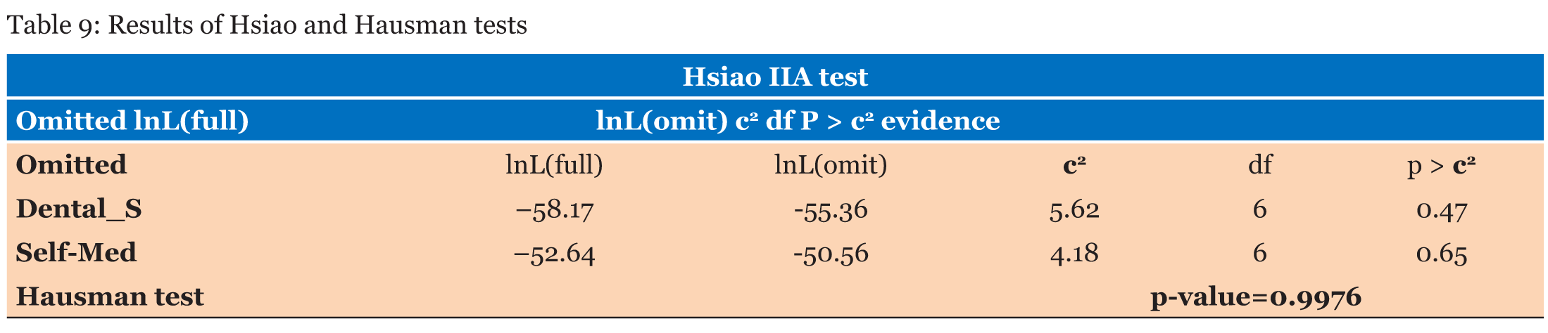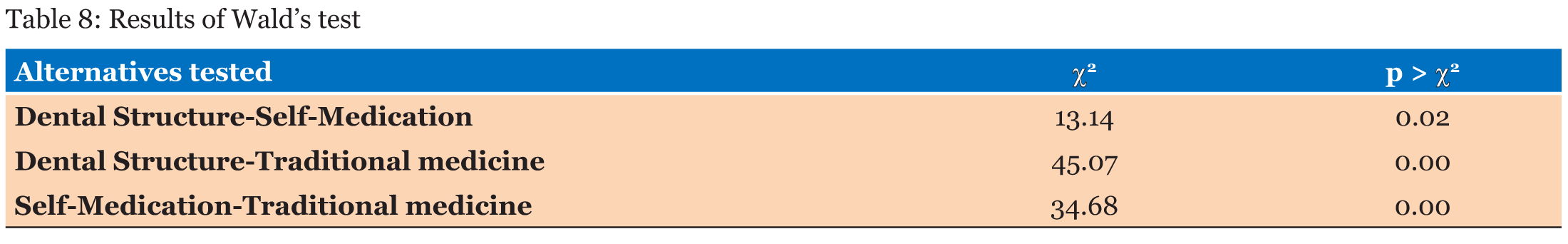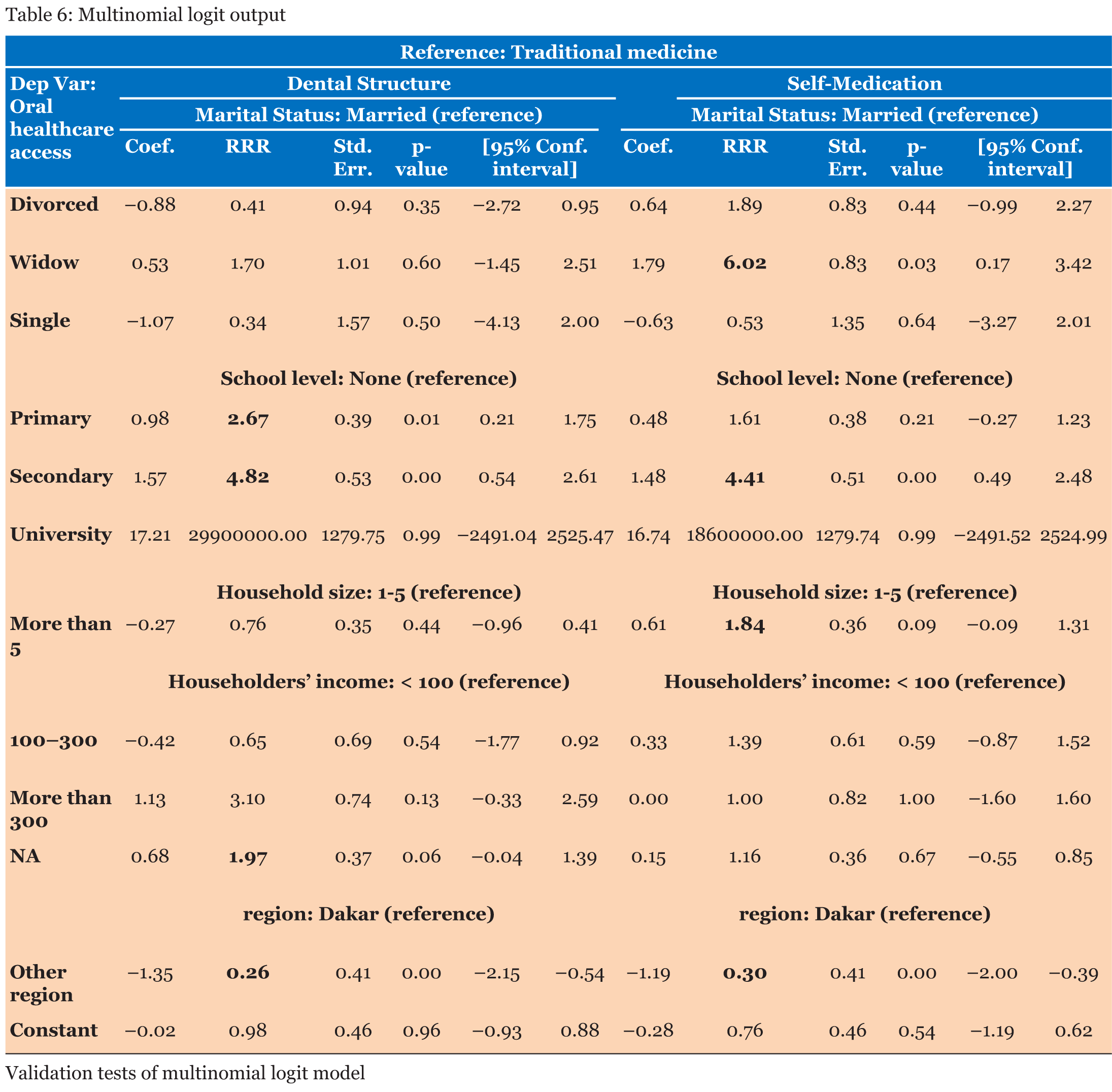 In the previous section, descriptive statistical analysis has been done and oral healthcare access has been found to be statistically related to many socio-economic characteristics of householders. In this section, oral healthcare access determinants will be identified using a multinomial logit model. This model is used to explain individual choices by either individual characteristics or choice characteristics or both. Table 6 presents the results of the computed model. Traditional medicine has been chosen as the baseline modality and modality having significant positive effect on alternatives (dental structures or self-medication), have their corresponding colored in green while those having significant negative affect have red colored corresponding cells. | ||||||
