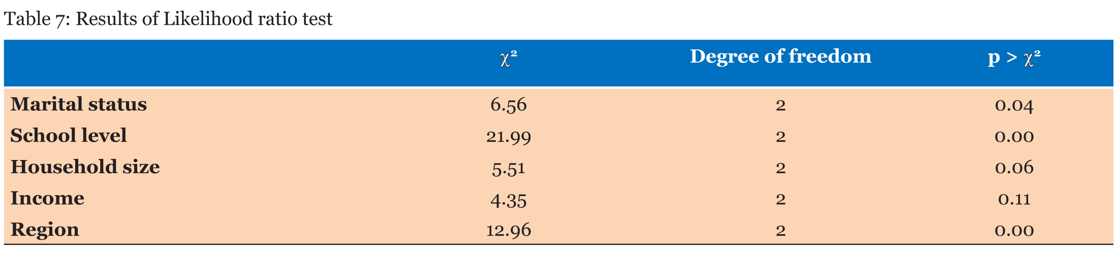 Widow householders are six times more likely to practice self-medication instead of using traditional medicine than married ones (Table 6). Moreover, householders with a university school level are four times more likely to practice self-medication instead of using traditional medicine than those with none school level. When it comes to household size, the results show that household having more than five members are more likely to practice self-medication instead of using traditional medicine than those having less than five members. In contrary, household living out of Dakar are more likely to use traditional medicine than to practice self-medication (Table 7) (Table 8) (Table 9). | ||||||